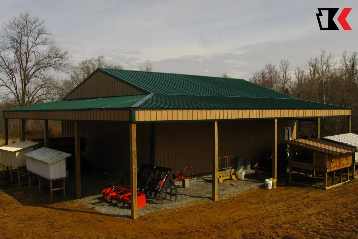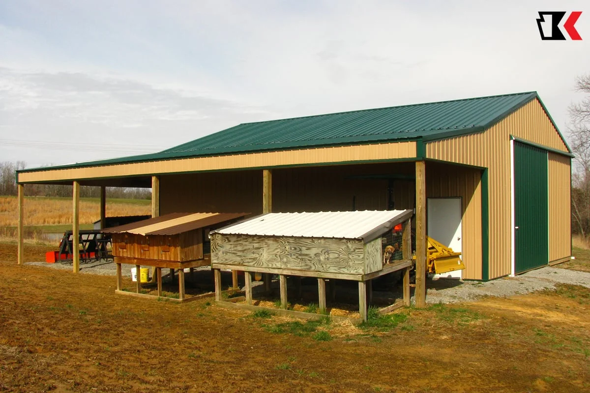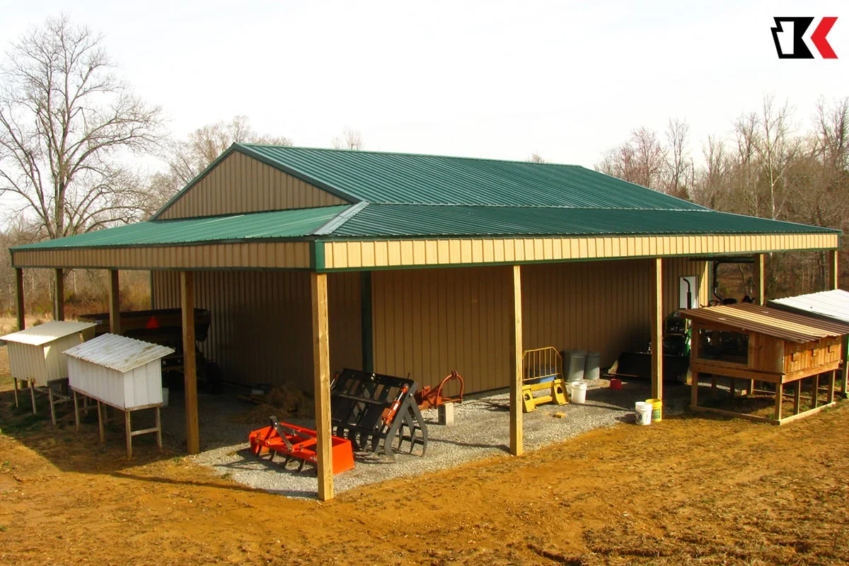 This efficiently designed green and tan farm shop offers ample storage space and boasts a convenient large sliding door that facilitates easy entry. Additionally, it features a covered wrap-around lean-to on the back side, providing additional protected space for equipment or outdoor activities.