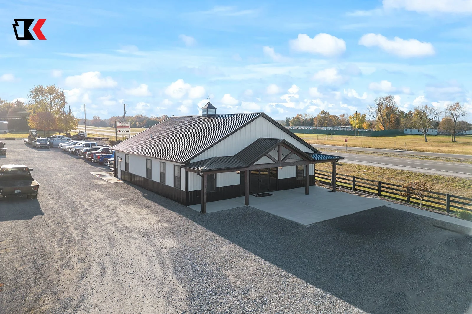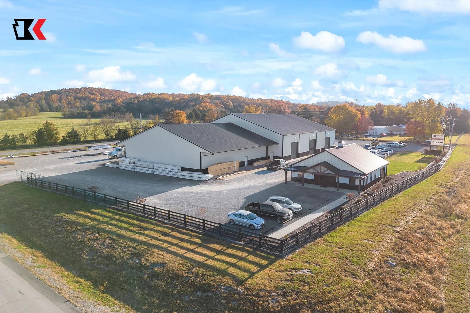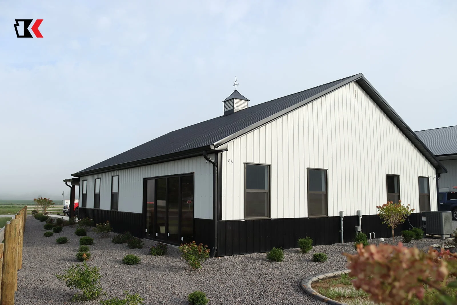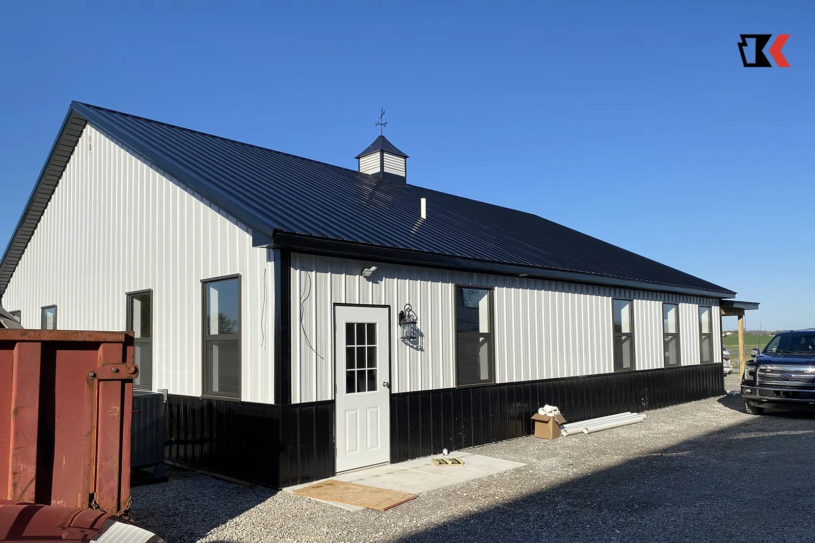 Our brand new office building boasts sharp contrasts between the black and white siding and large windows. The louvered cupola and exposed gable truss offer examples of some of our most popular building accents with customers.