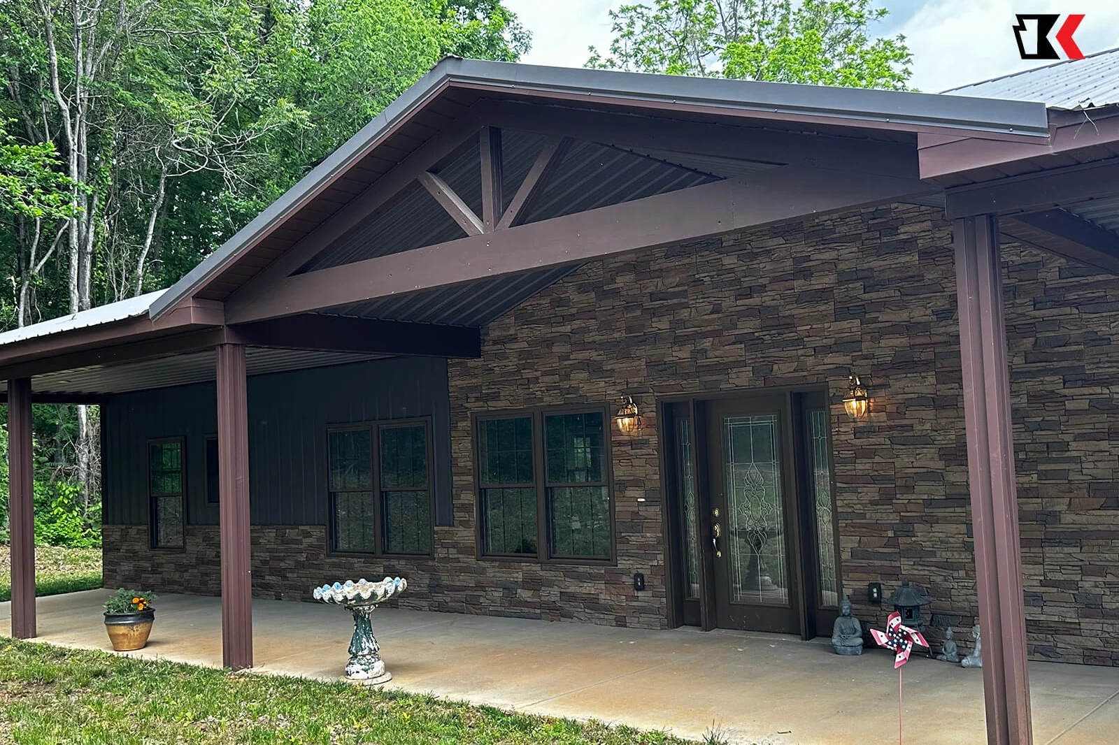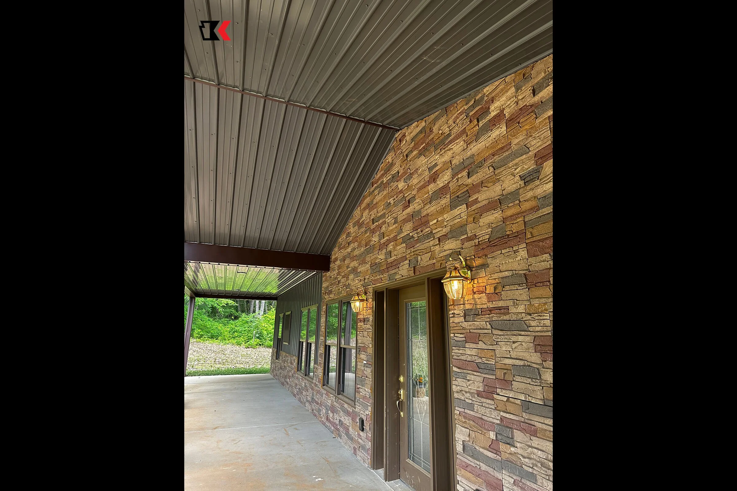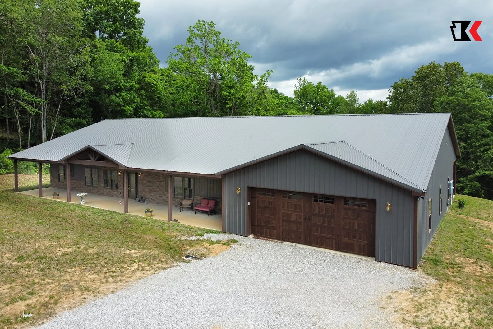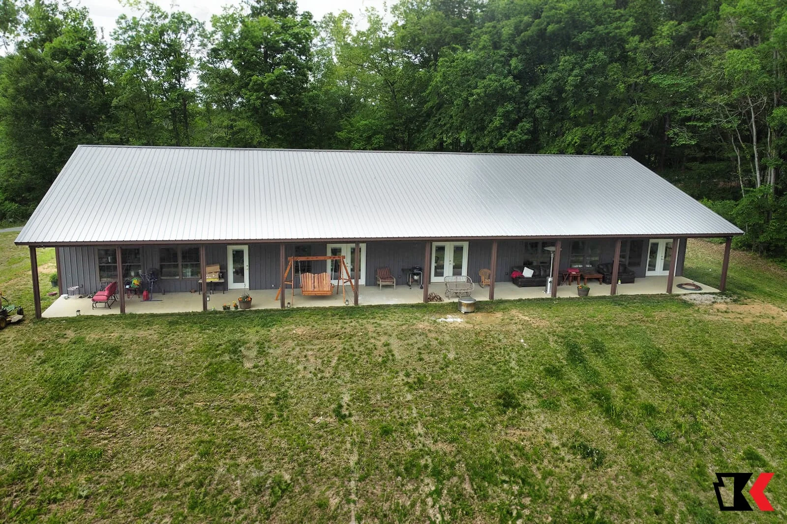 This beautifully rustic tudor brown and charcoal barndo has a gorgeous 70 foot wide covered front porch area with a 20 ft exposed gable truss. On the backside it also boasts a beautiful 100 ft full length covered back porch area. This home is set up for enjoying the countryside views!