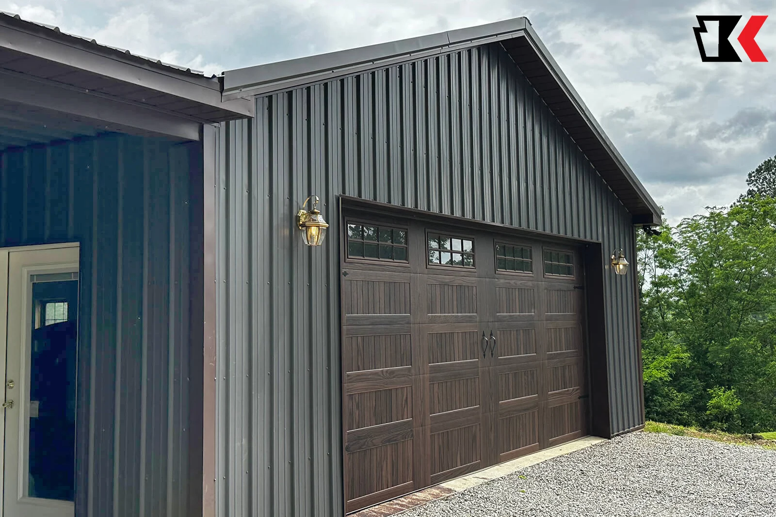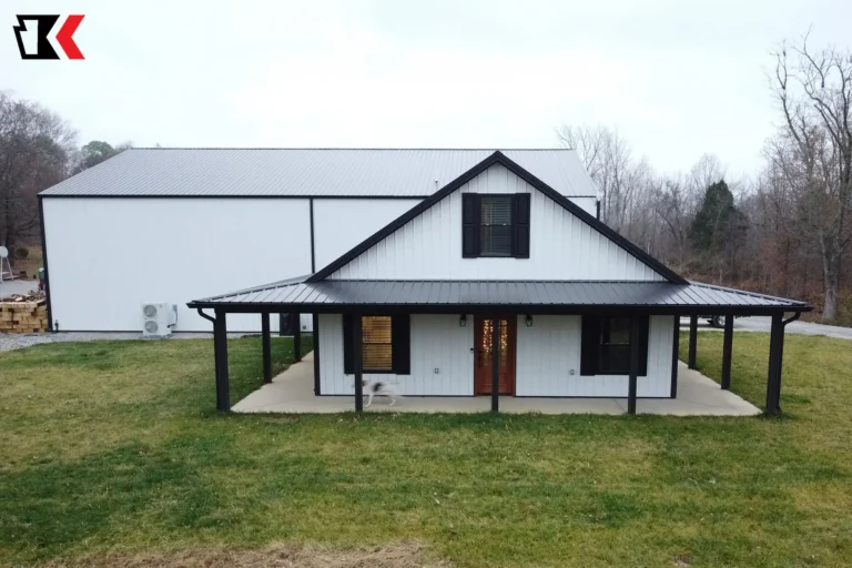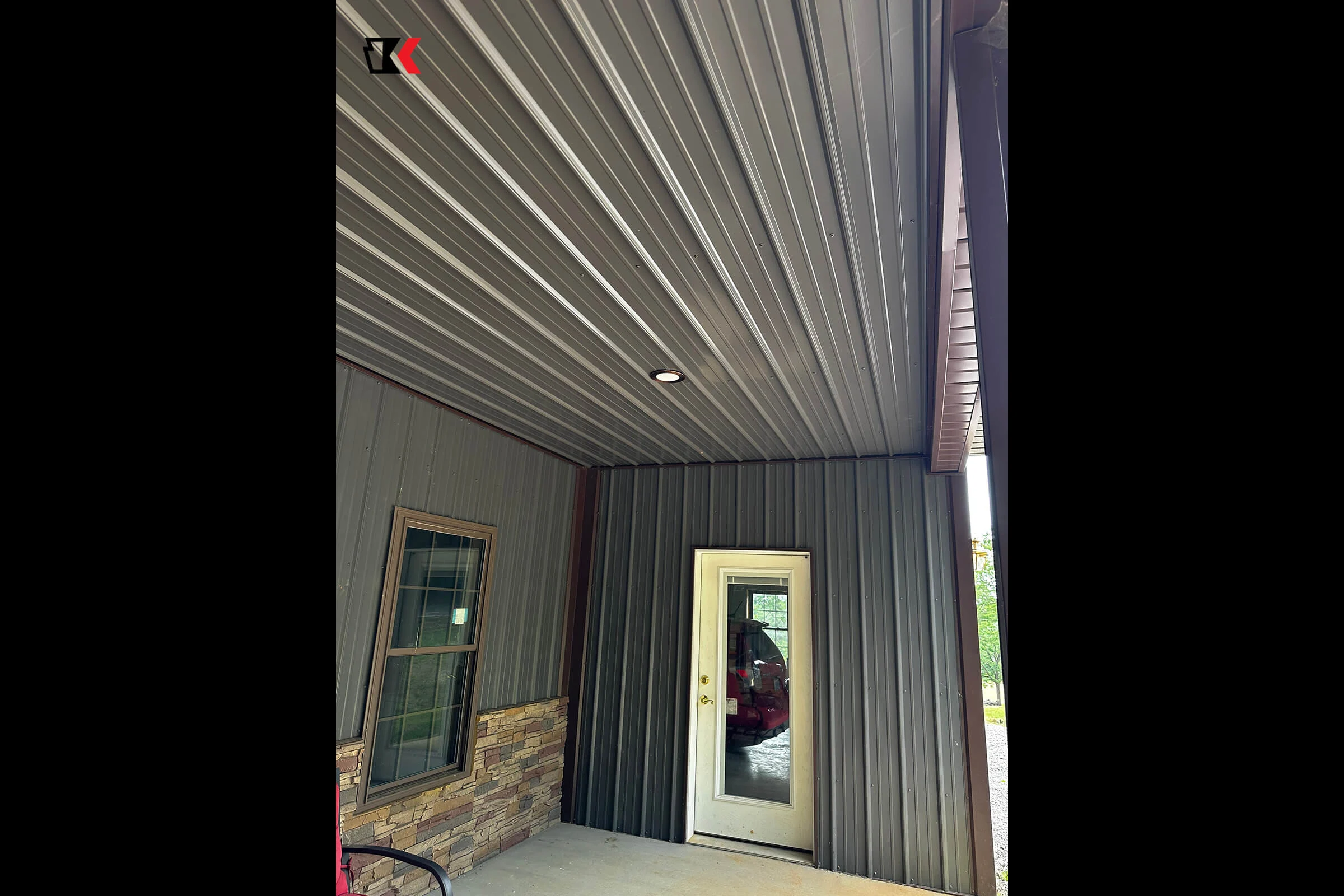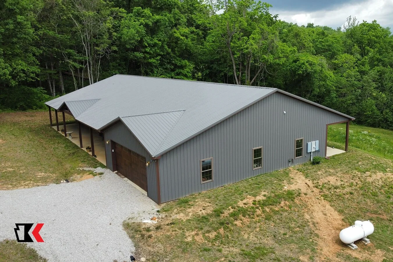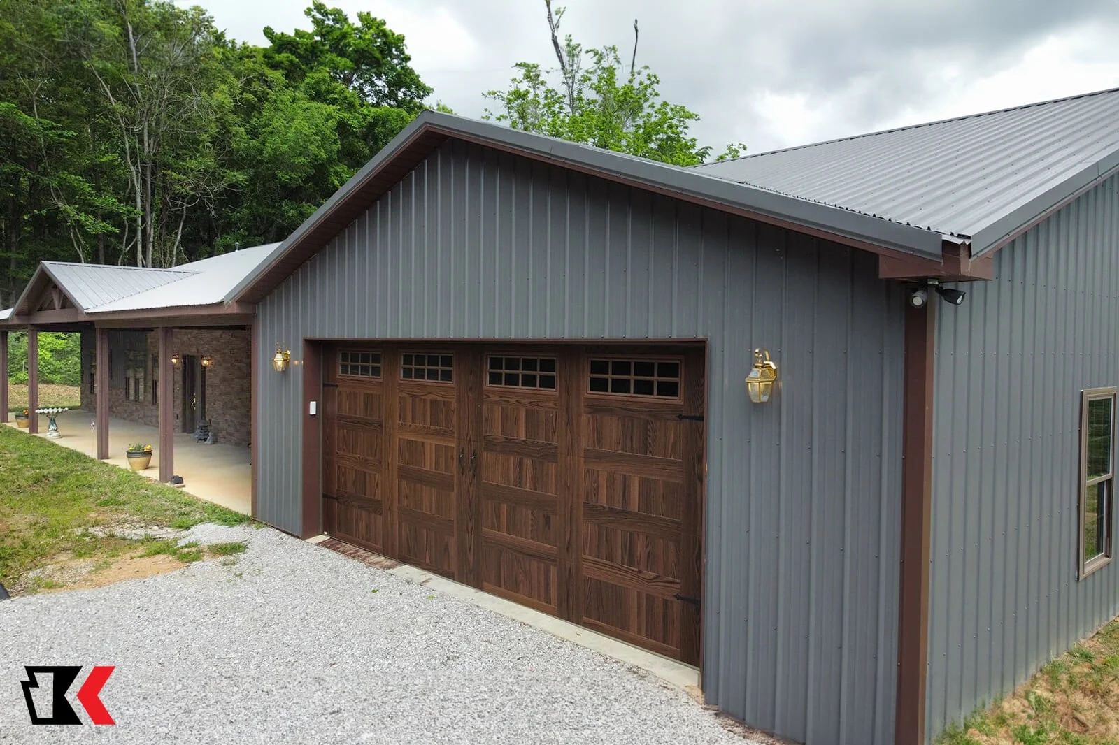 This beautifully rustic tudor brown and charcoal barndo has a gorgeous 70 foot wide covered front porch area with a 20 ft exposed gable truss. On the backside it also boasts a beautiful 100 ft full length covered back porch area. This home is set up for enjoying the countryside views!