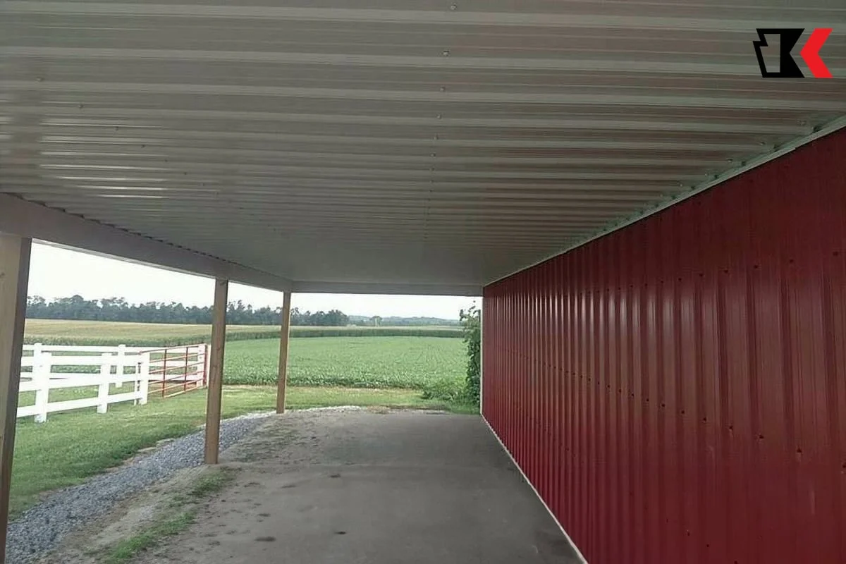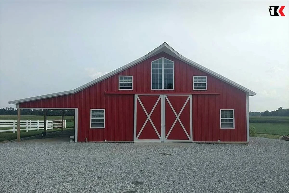 This eye-catching farm pole barn is painted a vibrant ruby red and features a widowed peak, sliding farm doors, a covered lean-to, and beautiful large windows with elegant white trim.
