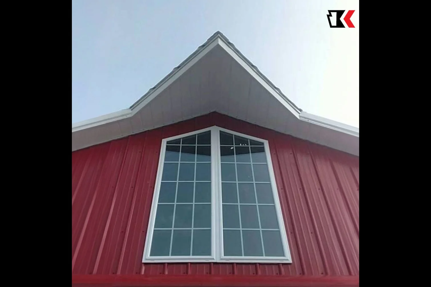 1 – 12’x10′ Sliding Bright Red Door with white trim, 2 – 6×50 windows with 22.5 angle at the top.