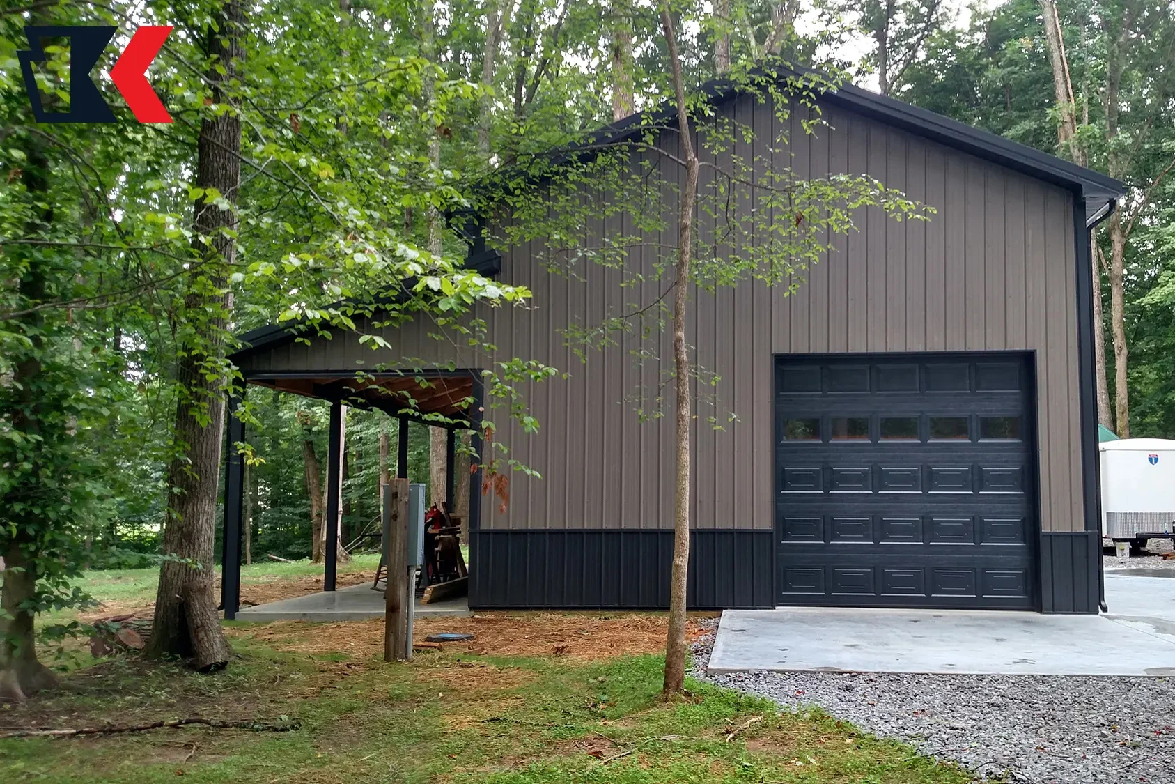 This tan and black barndo is perfect for connecting with nature. Sit on the covered porch and relax in a rocking chair while still having plenty of additional space on the porch and in the garage for working on projects!