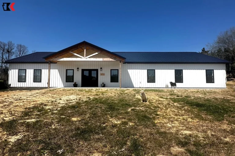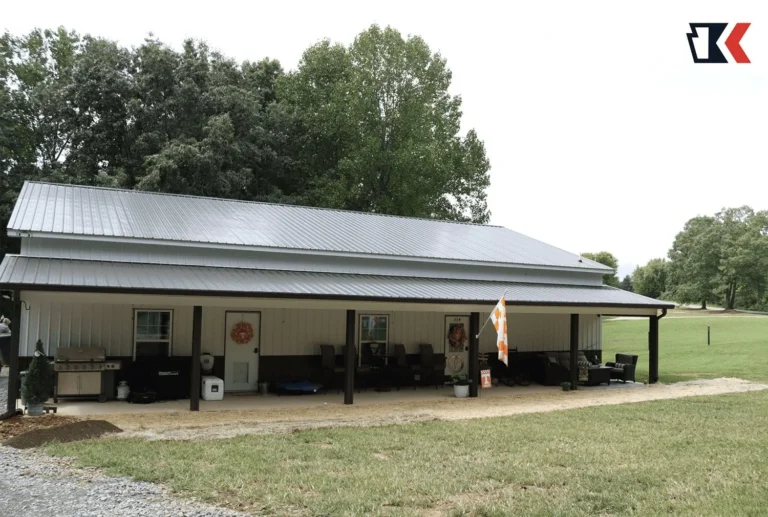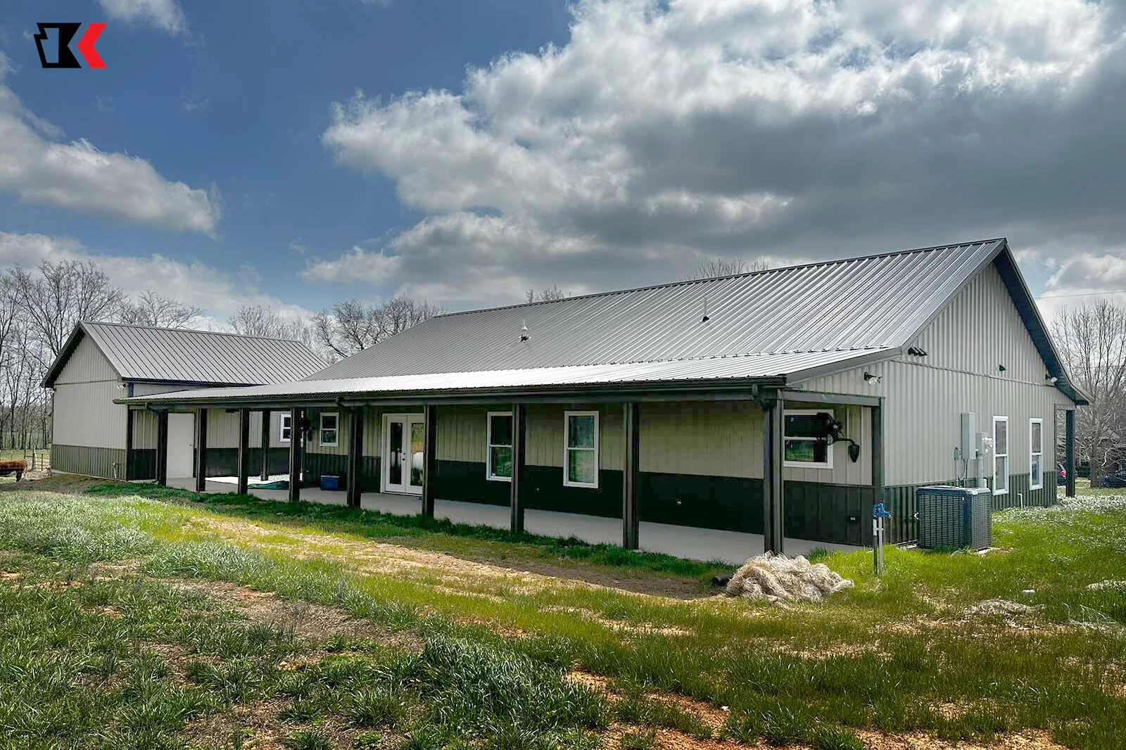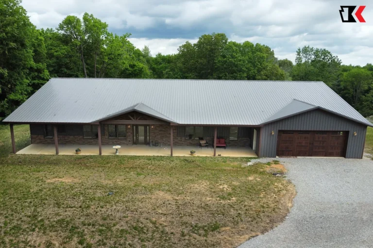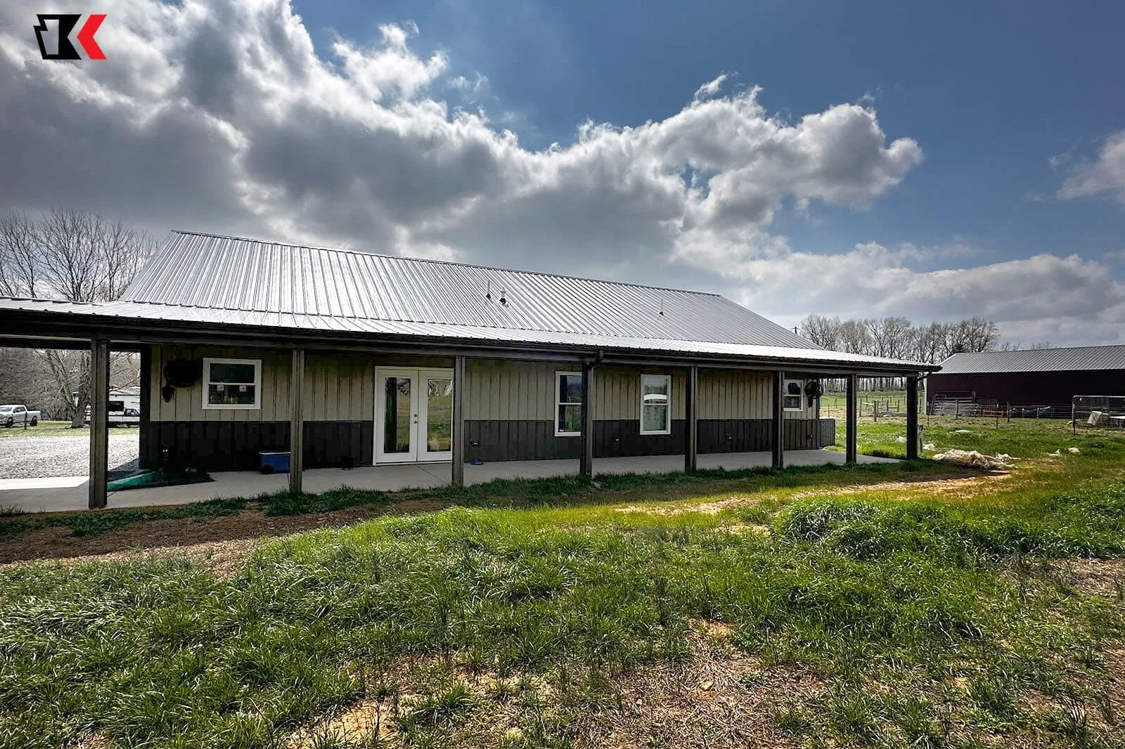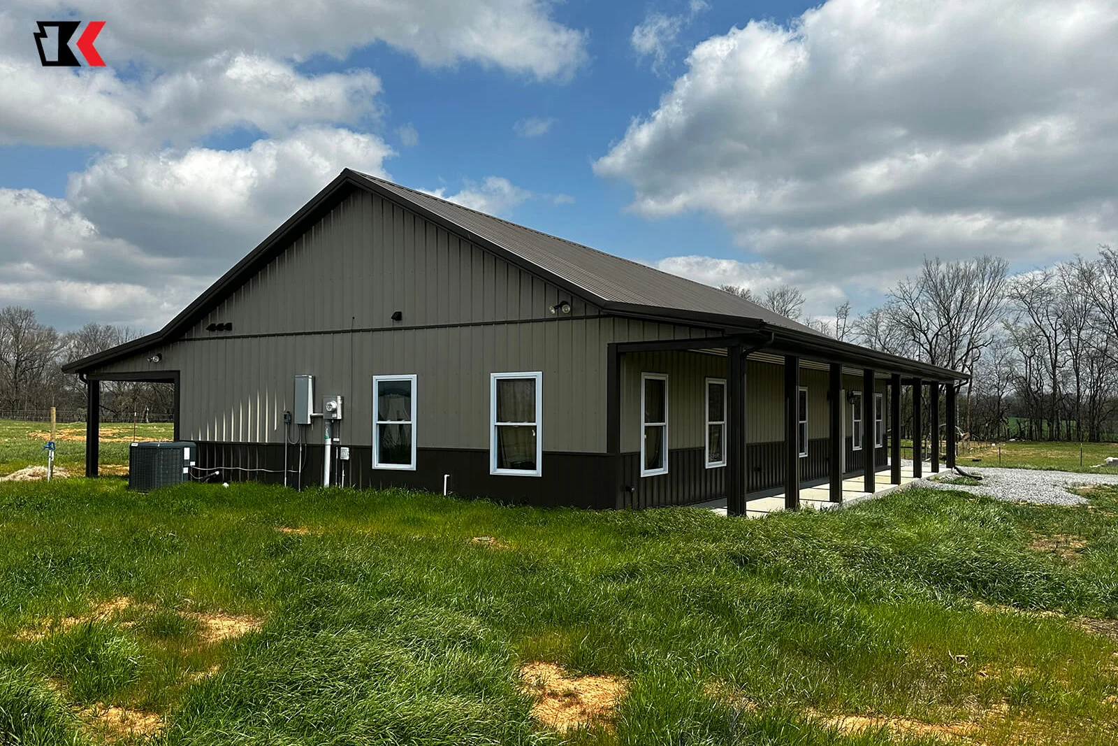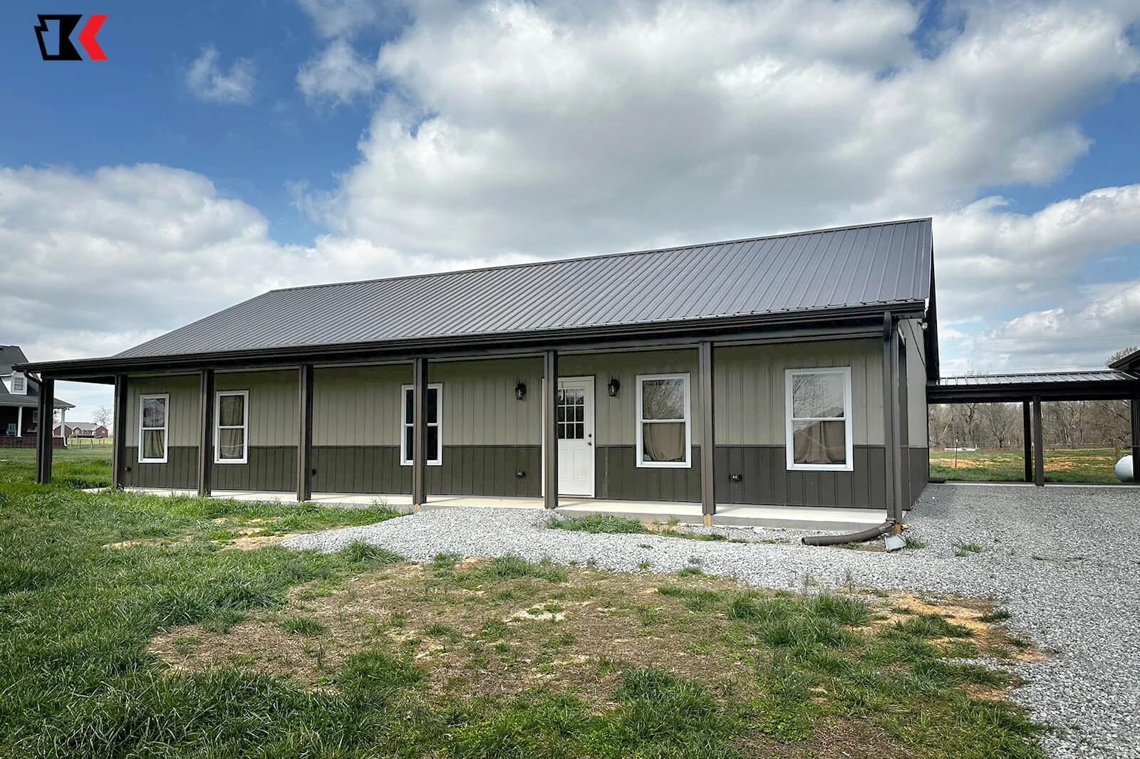 This antique bronze barndo provides shade around most of the home with matching lean-tos in the front and back. It also sports a unique covered walk to the matching garage!