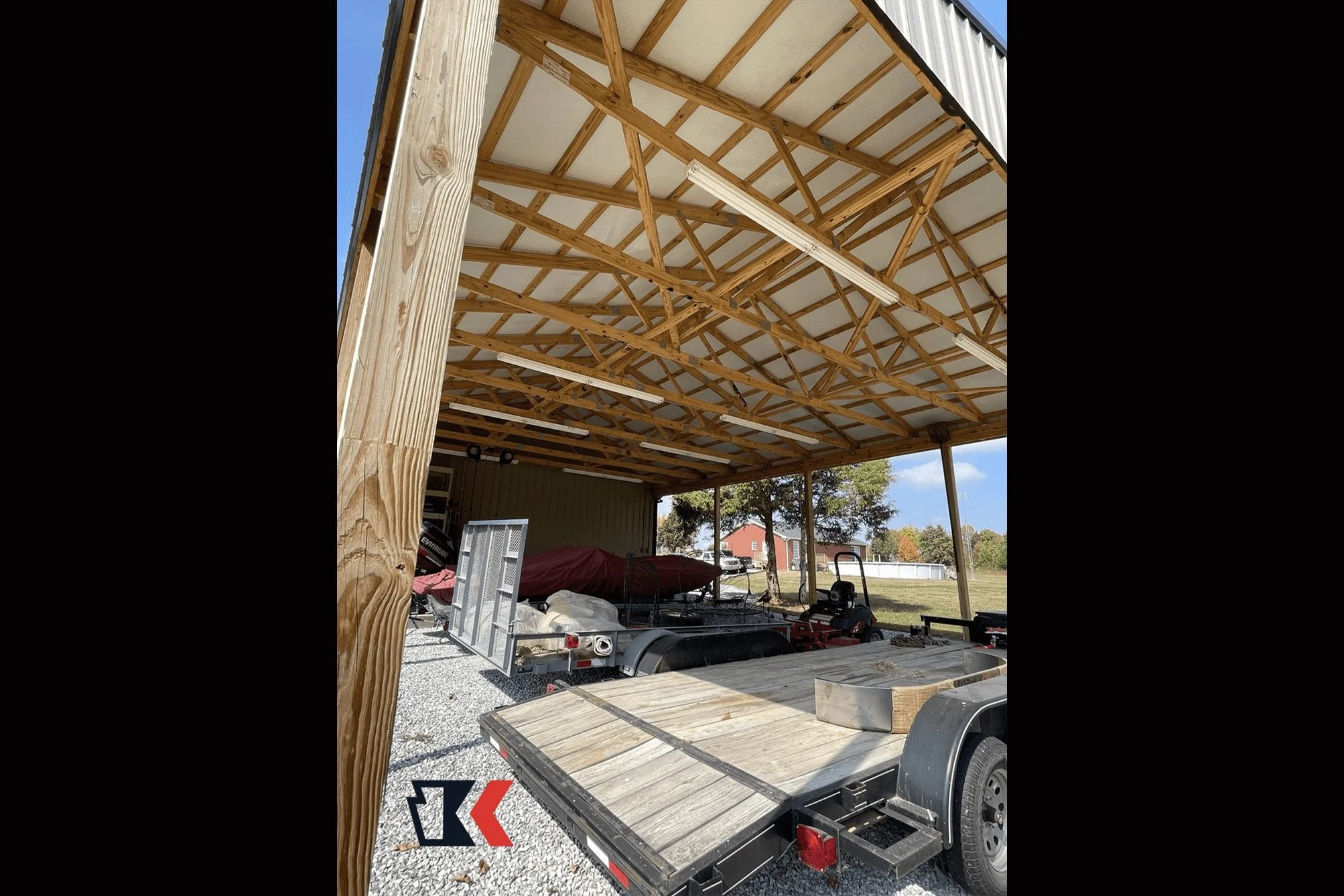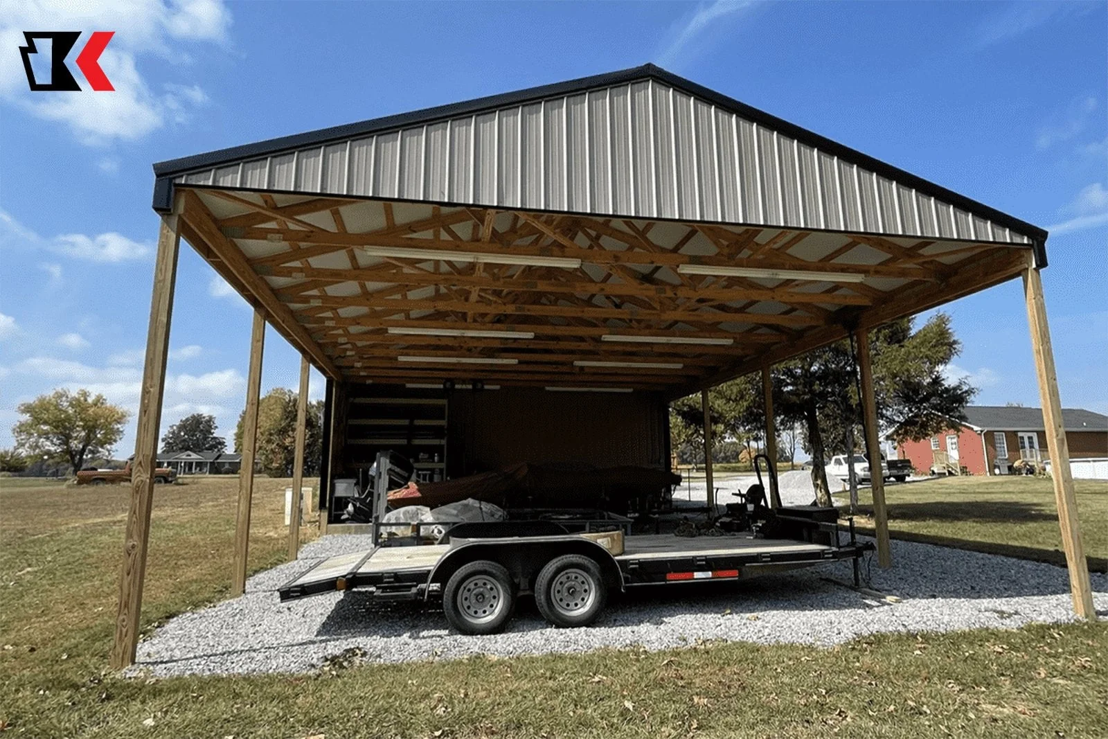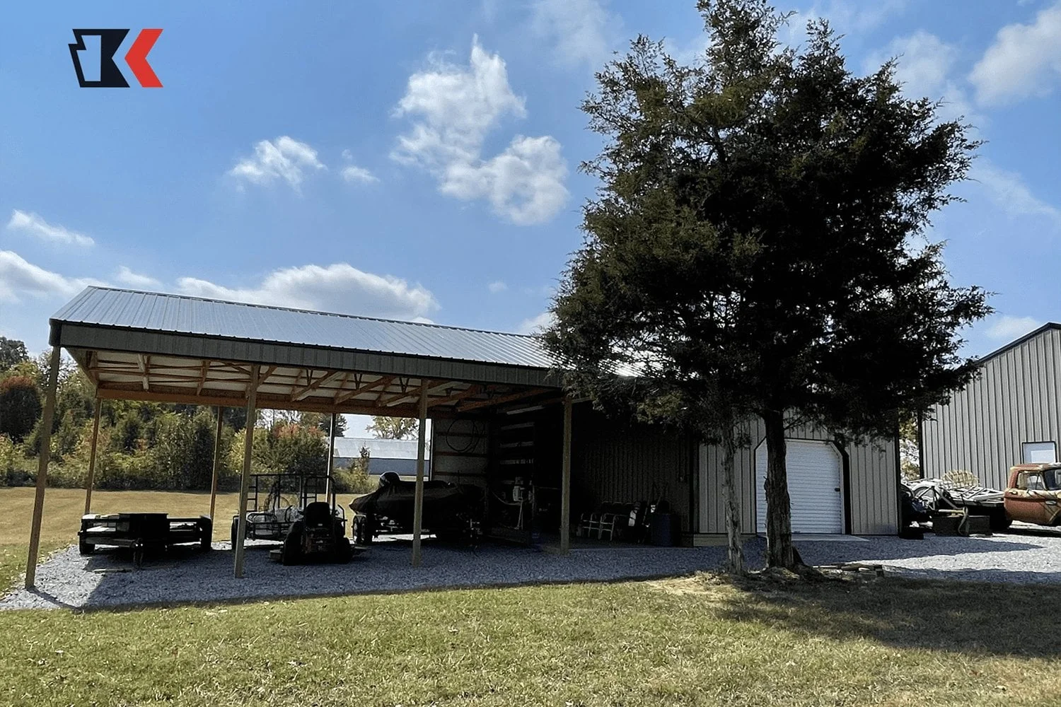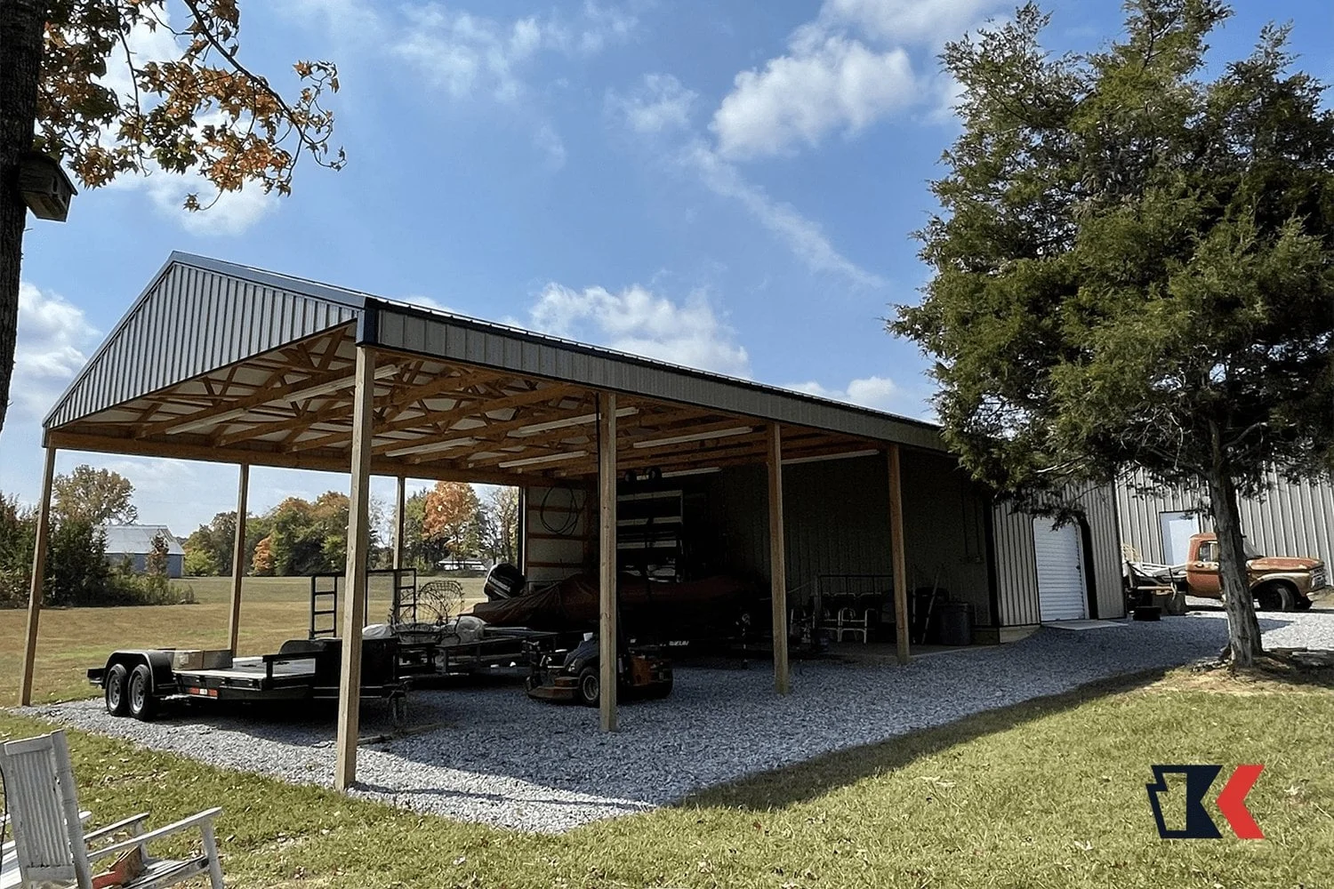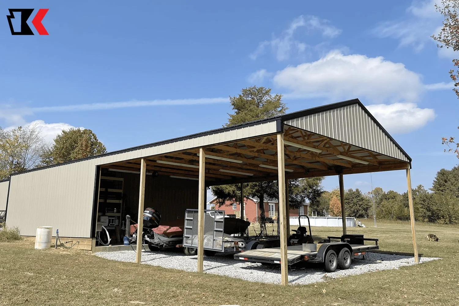 This backyard equipment workshop offers both enclosed and open options for equipment storage and protection from the elements. The open design on front and back makes it easy to get equipment in and out as needed.