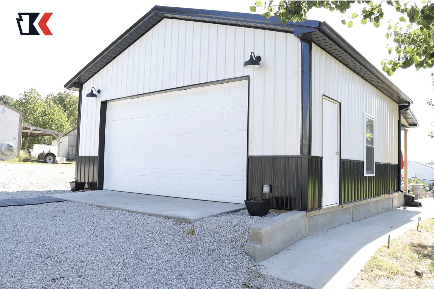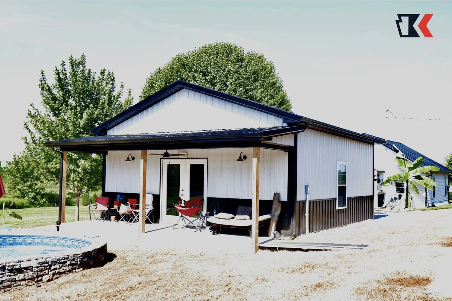This high contrast black and white garage features a drop down lean to sitting area on the back for some relaxation by the pool.